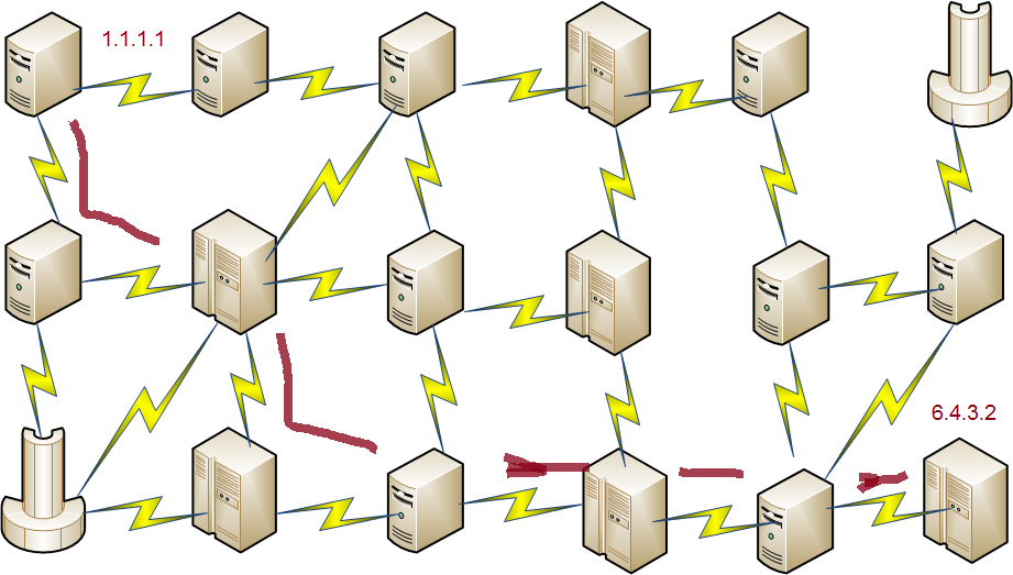 Par exemple, pour envoyer un paquet depuis le noeud 1.1.1.1 jusqu'au 6.4.3.2 on aurait :