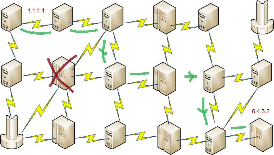 La robustesse du système est excellente car si un des ordinateurs est détruit, un autre chemin est trouvé :